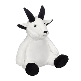 Self-contained stuffing pods for the head and belly are removable through a hidden zipper on the bottom of the goat so if you ever need to wash Garvin Goat it is very easy to do so.